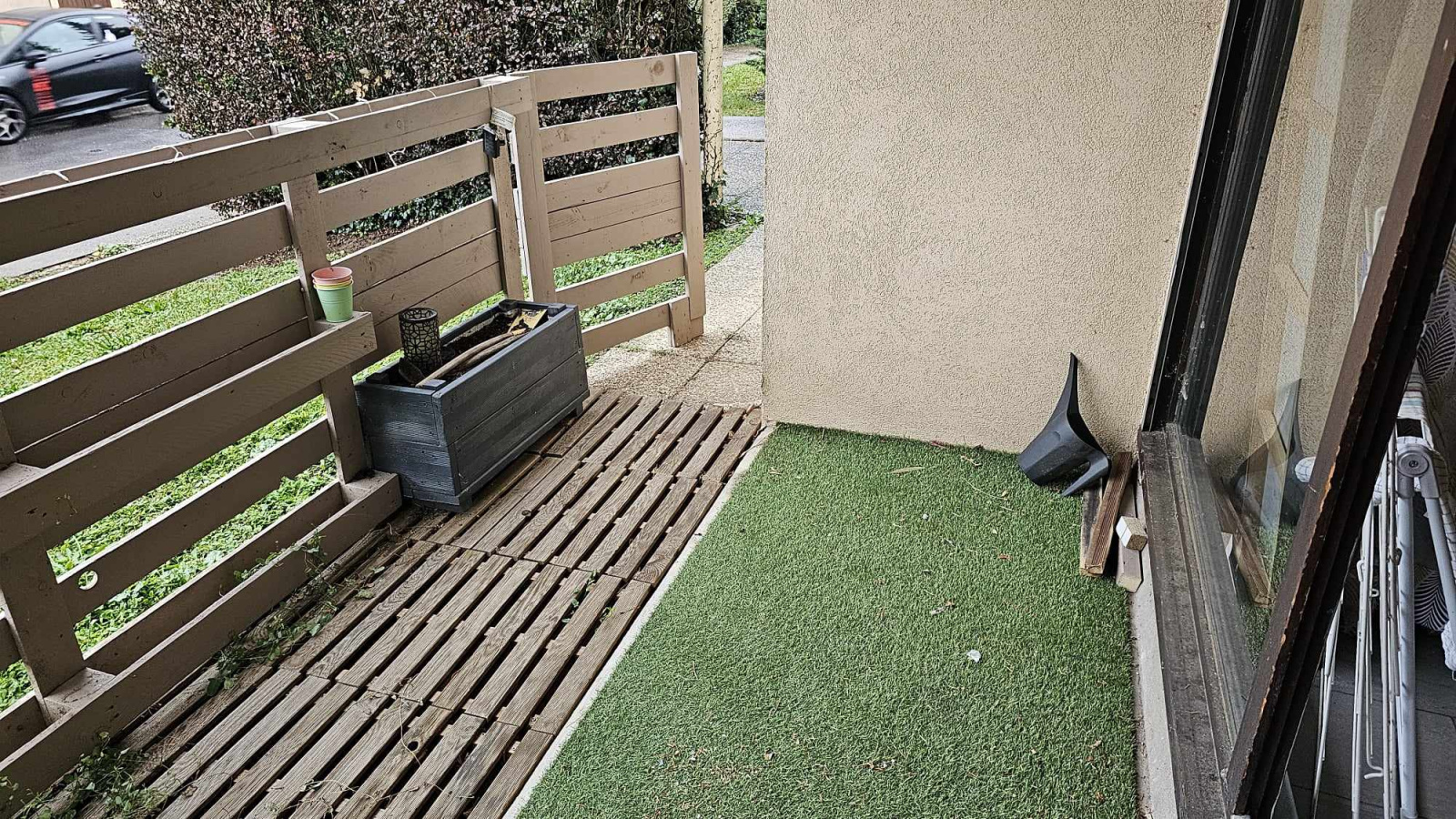 Une entrée avec placard, une pièce de vie, une cuisine équipée, une grande chambre avec dressing, une salle de douches avec un W.C, un parking privatif et une terrasse.